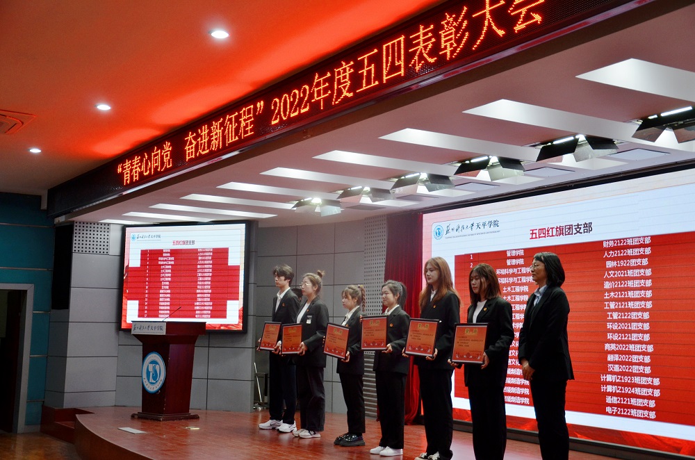 表彰大会在激昂的国歌中拉开帷幕。院团委书记刘亚男宣读了《关于表彰2022年度院“五四红旗团总支”、“青年五四奖章”等先进集体和优秀个人的决定》,智能制造学院团总支、艺术学院团总支荣获2022年度院“五四红旗团总支”称号,财务2122班团支部等17个团支部荣获2022年度院“五四红旗团支部”称号,王豪杰等14名青年荣获2022年度院“青年五四奖章”称号,王莉等112名青年荣获2022年度院“优秀共青团干部”称号,陈玛丽等266名同学荣获2022年度院“优秀共青团员”称号,人力2021班团支部 “党史学习教育,塑造强大内核”等8个项目被评为“优秀主题团日活动”。现场领导为获奖集体和个人代表颁发荣誉证书、奖状。