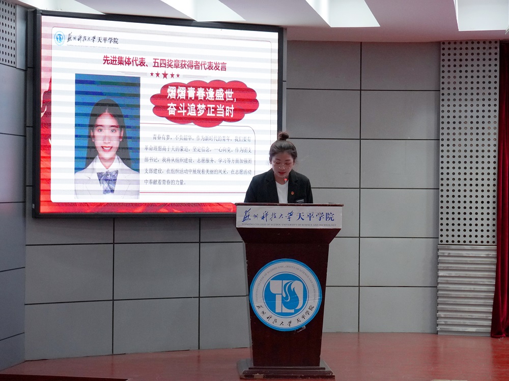 大会中,先进集体和优秀个人代表发言。“青年五四奖章”获得者刘秀明表示,作为一名大学生党员,将化为榜样力量,书写青春之歌,担当起新时代下的青年使命,以实际行动发挥大学生党员的先锋模范作用。作为“五四红旗团支部”获奖集体代表,财务管理2122班团支部书记沈赵佳从“思想引领、组织建设、志愿服务”等方面展示了团支部的成长之路、奋斗之旅。