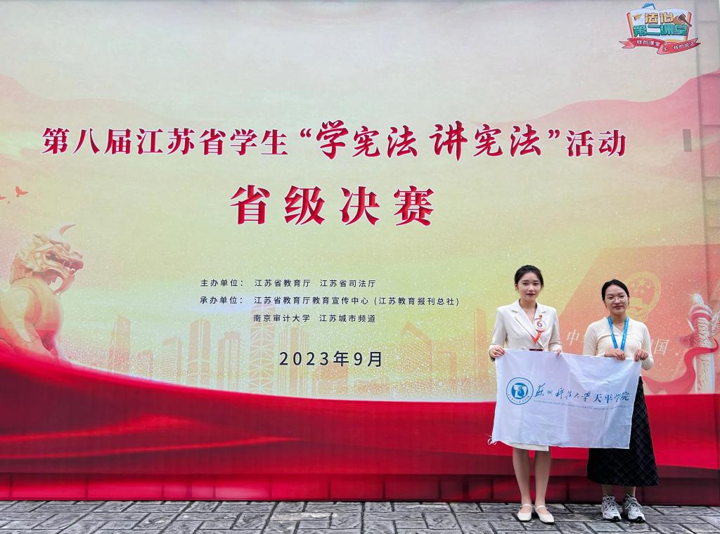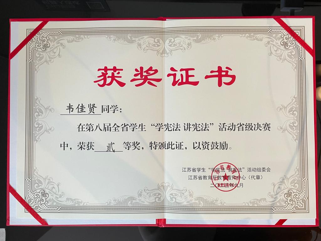 为全面学习贯彻党的二十大精神,深入学习贯彻习近平法治思想,推动青少年宪法宣传教育常态化长效化,9月23—24日,第八届江苏省学生“学宪法 讲宪法”活动省级决赛在南京举行。beat365语言文化学院秘书2122韦佳贤同学参加高校组演讲比赛,获得省级二等奖。
