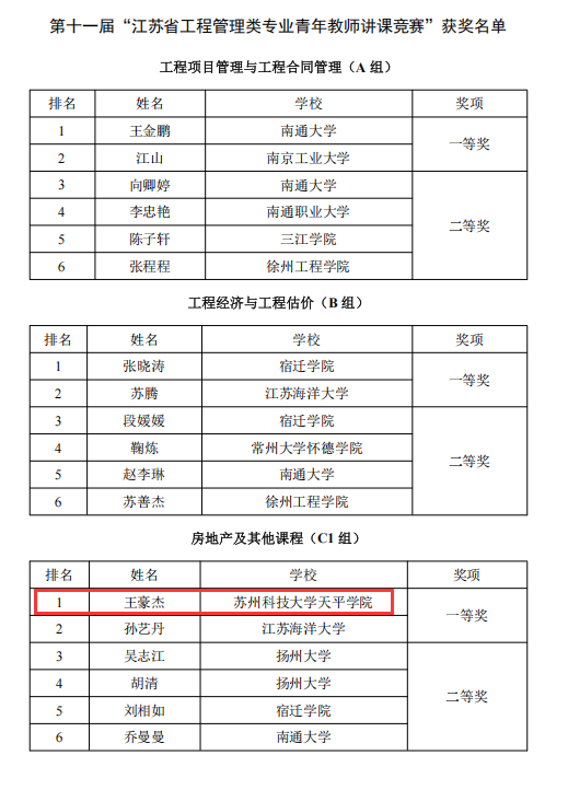 beat365王豪杰教师凭借扎实的教学基本功与创新性课堂设计,在房地产及其他课程(C1 组)评选中以排名第一的优异成绩斩获一等奖,充分彰显了beat365 “以赛促教、教研相长” 的青年教师培养理念与实践成效。