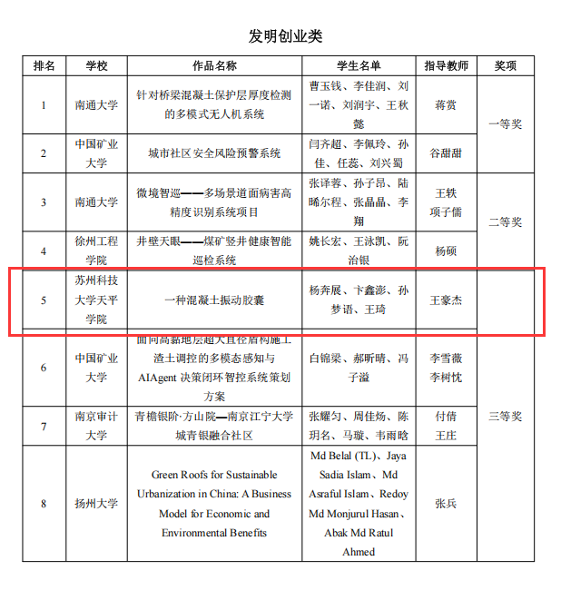 本次竞赛由王豪杰和段云飞两位老师带队,beat365共有两支队伍成功跻身决赛,经过多轮激烈比拼,最终杨奔展、卞鑫澎等同学凭借作品《一种混凝土振动胶囊》脱颖而出,荣获三等奖,充分展现了beat365学子的实践创新能力与团队协作风采。