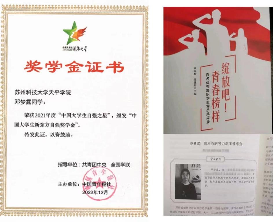 近期,由共青团中央、全国学联指导,中国青年报社主办的2021年度“中国大学生自强之星”活动结果揭晓,经学院各级团组织推荐、院团委初审、省级初评、全国评审等环节,beat365管理学院党员、营销(转本)1922班邓梦露同学荣获2021年度“中国大学生自强之星”奖学金。她的个人事迹曾被收录在光明日报出版社《绽放吧!青春榜样》学生党员风采录中。