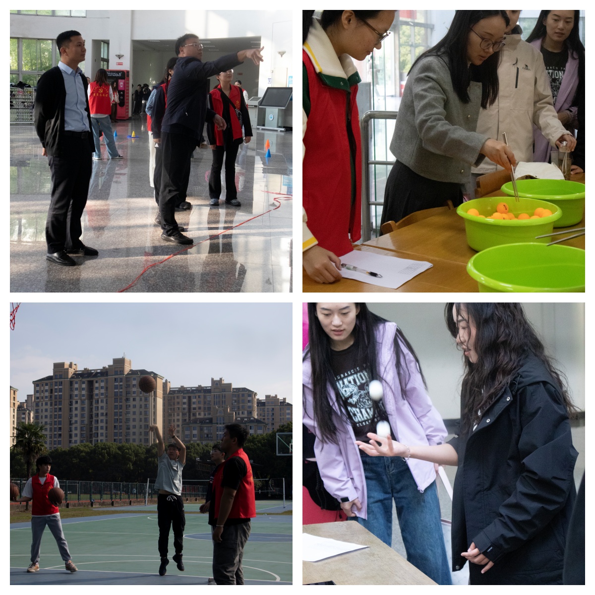 本次文体活动设置了飞镖、套圈、一分钟跳绳、一分钟定点投篮、夹乒乓球、一分钟抛接球、托球跑等比赛项目,教职工们纷纷热情参与,全情投入。图书馆内,篮球场上,各项比赛精彩纷呈,气氛热烈,加油声、欢呼声此起彼伏,大家脸上洋溢着欢乐的笑容。
