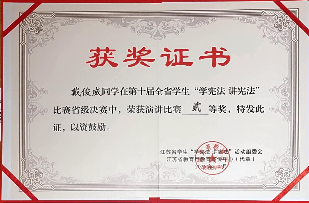 近日,由江苏省教育厅主办,江苏省教育厅教育宣传中心承办,江苏警官学院协办的江苏省第十届全省学生“学宪法 讲宪法”比赛省级决赛闭幕。beat365土木工程学院土木2322班级学生戴俊威荣获演讲比赛高校组二等奖,孙纯老师获优秀指导教师。
