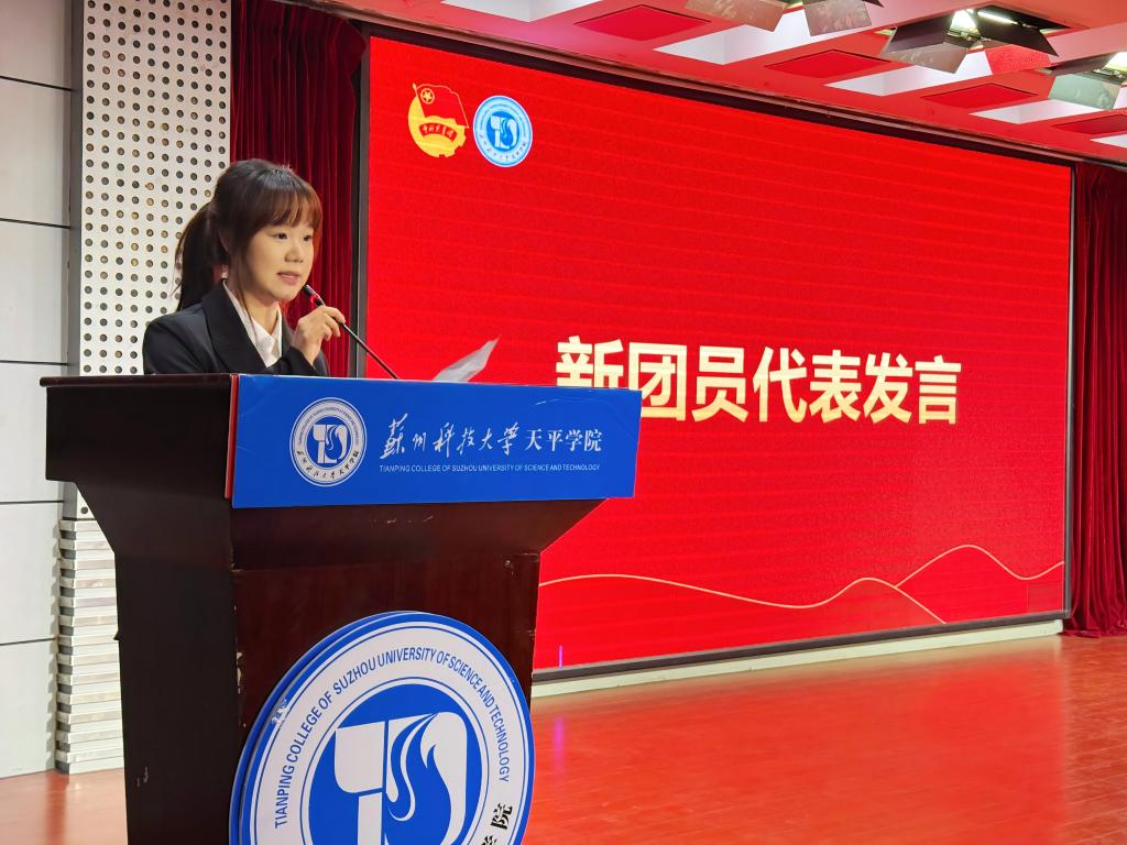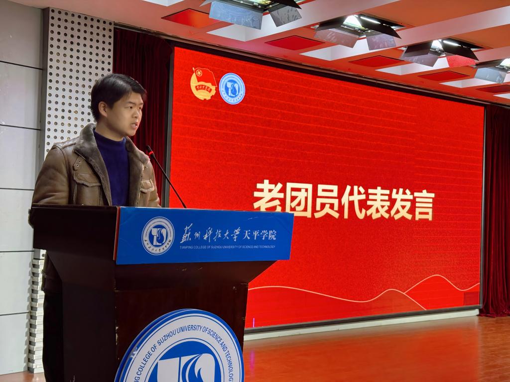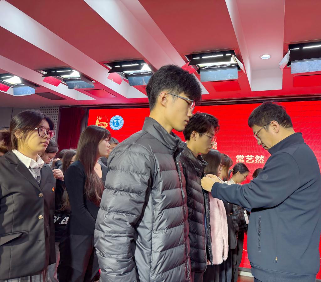 仪式在庄严的国歌声中拉开帷幕。团委书记刘建琦老师宣读新团员代表名单并为他们佩戴团徽。宣誓礼上,新发展团员们举起右拳,面向鲜红团旗庄严宣誓:“我志愿加入共产主义青年团……”誓言铿锵回荡在会场,承载着新团员对团组织的向往,彰显新时代青年奋斗的坚定信念。新团员代表刘莹同学表达了加入共青团的激动与自豪之情,坦言共青团是青年成长路上的鲜明旗帜。老团员代表王毅同学则分享经验,号召全体新团员,未来要以优秀团员标准严格要求自己,在学习中精进、生活中奉献,紧跟组织步伐,以行动诠释青年担当。