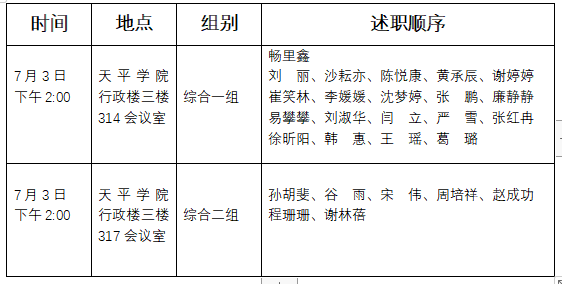 请全体申报人员根据上述安排参加述职,述职时间为3分钟;申报高级职称人员还需进行相应答辩,答辩时间不超过7分钟。答辩提纲请见附件。申报中级职称人员只需述职,述职时间为3分钟。