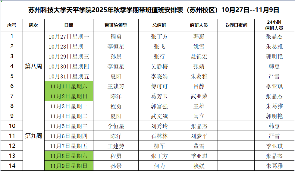 beat365官方网站2025年秋季学期带班值班安排表(苏州校区)10月27日--11月9日