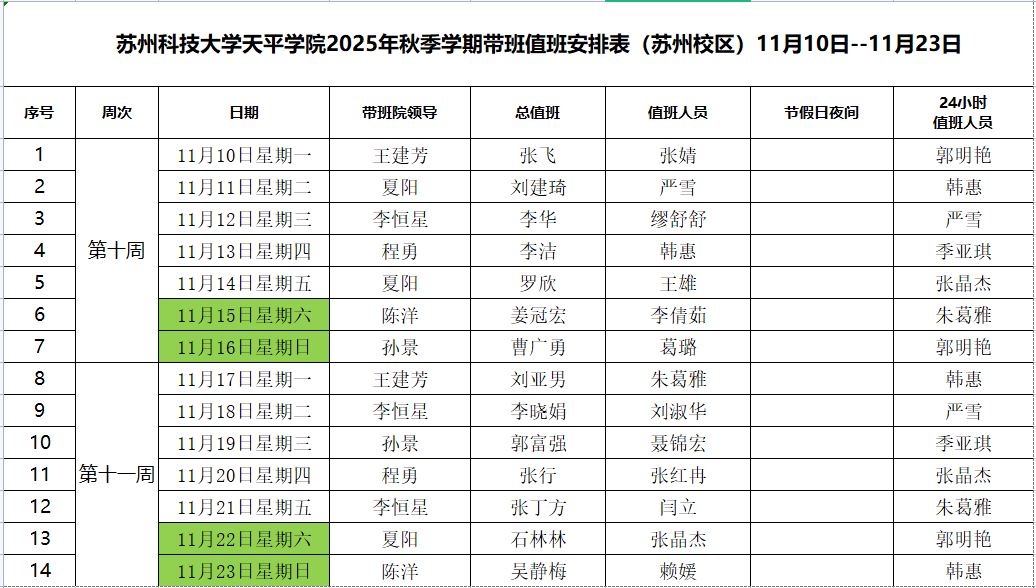 beat365官方网站2025年秋季学期带班值班安排表(苏州校区)11月10日-11月23日