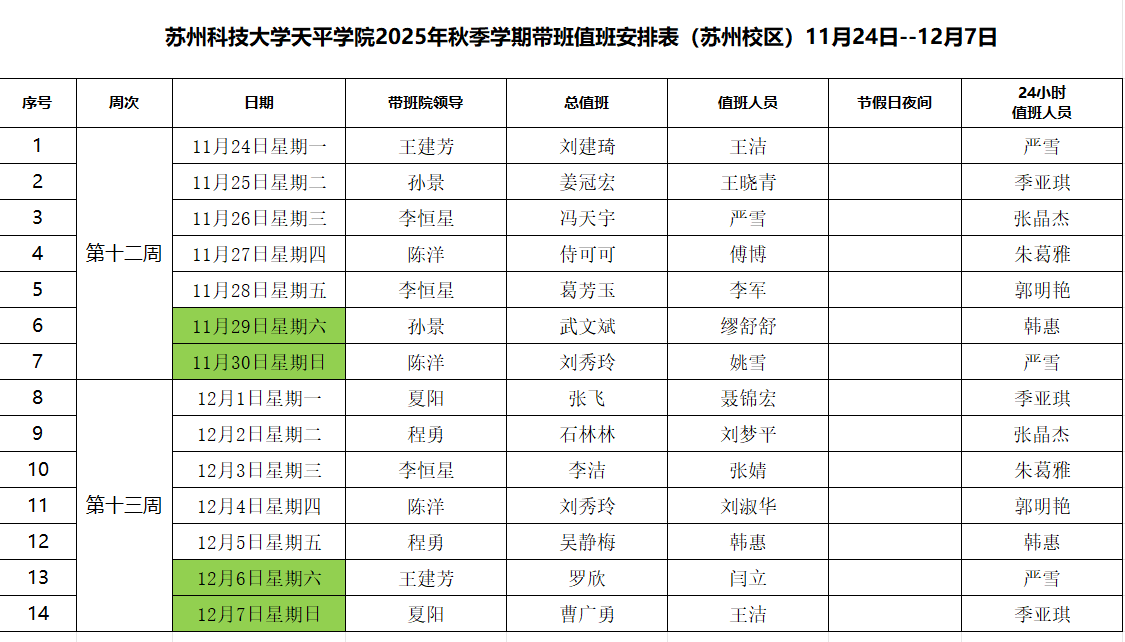 beat365官方网站2025年秋季学期带班值班安排表(11月24日--12月7日)