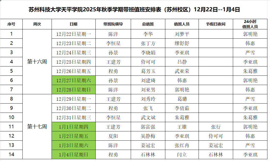 beat365官方网站2025年秋季学期带班值班安排表(12月22日--1月4日)