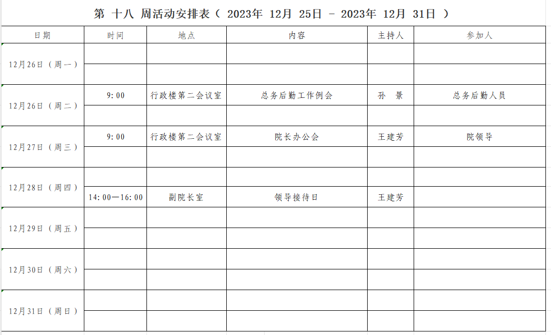 第 十八 周活动安排表( 2023年 12月 25日 - 2023年 12月31日 )