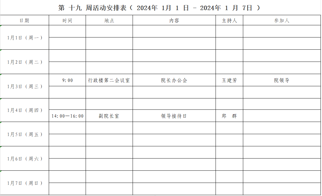 第 十九 周活动安排表( 2024年 1 月 1 日 - 2024年 1 月7 日 )