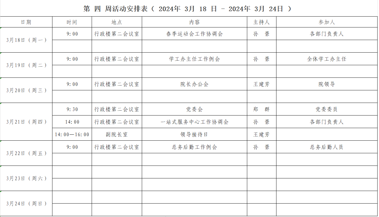 第 四 周活动安排表( 2024年 3 月 18 日 - 2024年 3 月 24 日 )