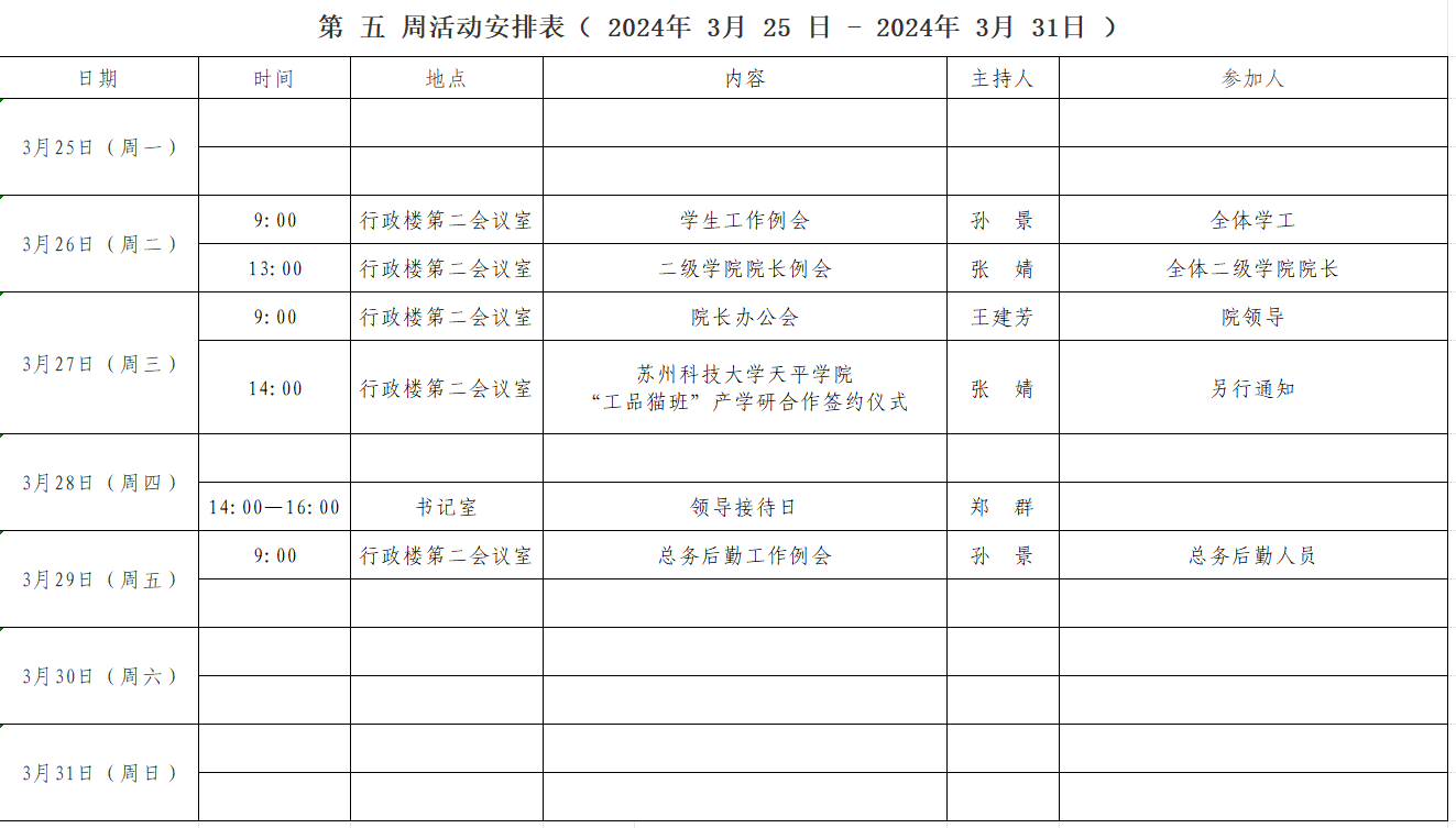 第 五 周活动安排表( 2024年 3 月 25 日 - 2024年 3 月 31 日 )