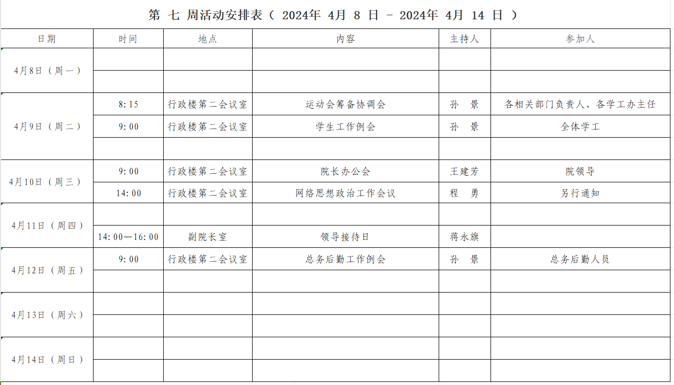 第 七 周活动安排表( 2024年 4 月 8 日 - 2024年 4 月 14 日 )