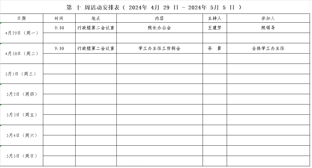 第 十 周活动安排表( 2024年 4 月 29 日 - 2024年 5 月 5 日 )