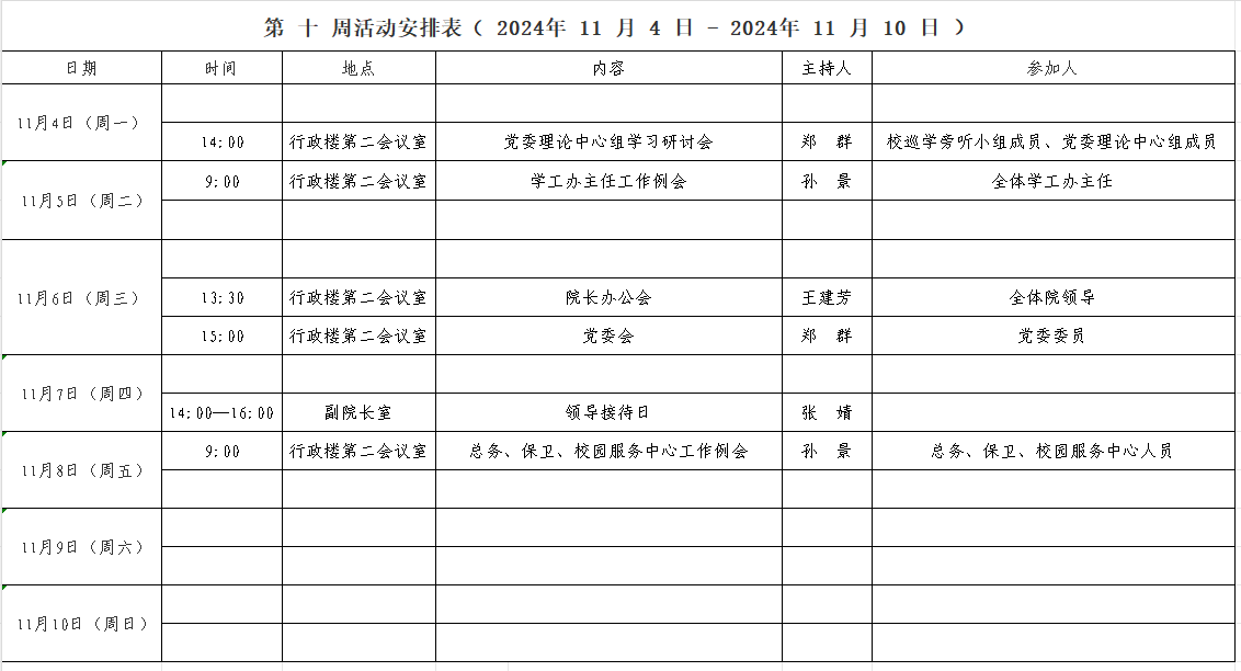 第 十 周活动安排表( 2024年 11 月 4 日 - 2024年 11 月10 日 )