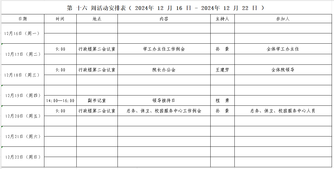 第 十六 周活动安排表( 2024年 12 月 16 日 - 2024年 12 月 22 日 )