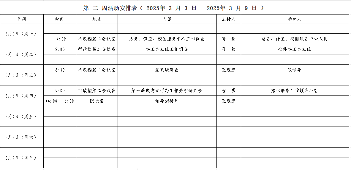 第 二 周活动安排表( 2025年 3 月 3 日 - 2025年 3 月 9 日 )