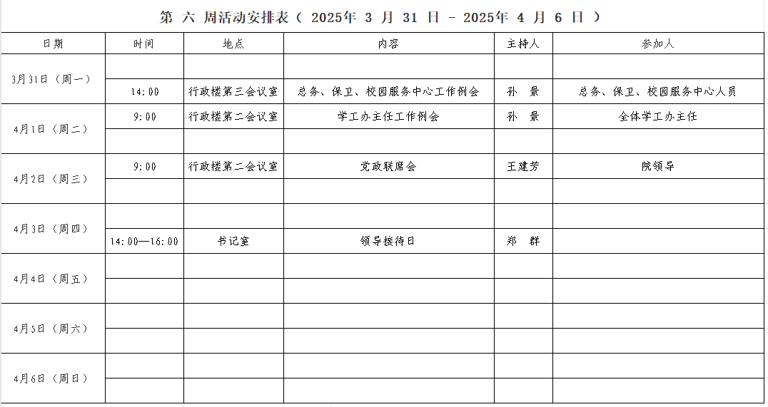 第 六 周活动安排表( 2025年 3 月 31 日 - 2025年 4 月 6 日 )