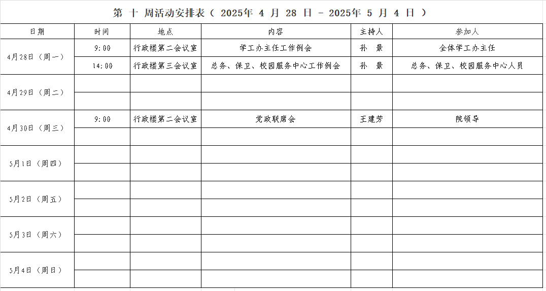 第 十 周活动安排表( 2025年 4 月 28 日 - 2025年 5 月 4 日 )