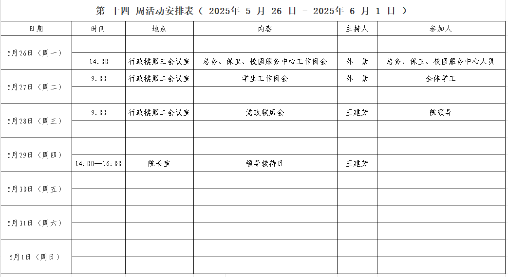 第 十四 周活动安排表( 2025年 5 月 26 日 - 2025年 6 月 1 日 )