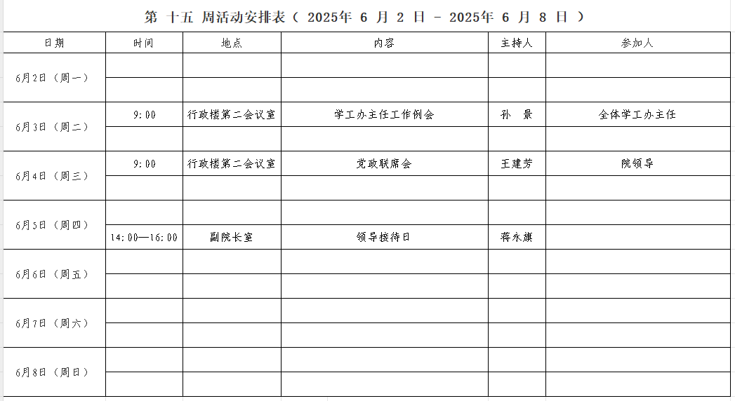 第 十五 周活动安排表( 2025年 6 月 2 日 - 2025年 6 月 8 日 )