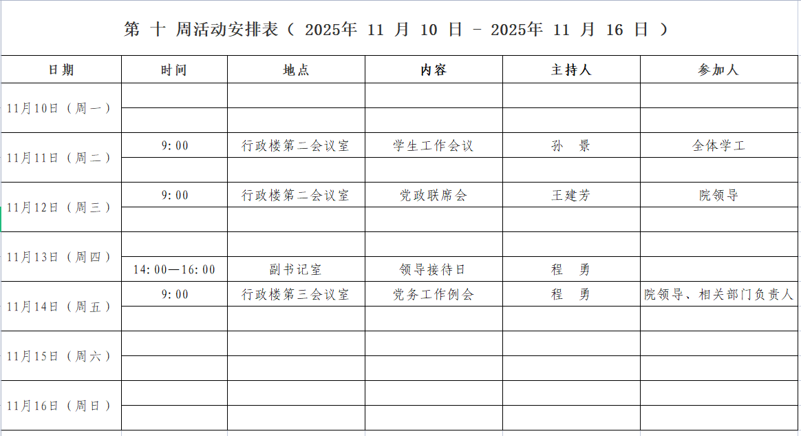 第 十 周活动安排表( 2025年 11 月 10 日 - 2025年 11 月 16 日 )