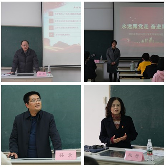 党委书记郑群围绕青年的使命担当,他用鲜活的案例勉励同学们珍惜学习时光,不负韶华,勤学担当,成人成才;院长王建芳勉励学生要多读书、勤思考,从书本中汲取智慧和营养,修身养志、增长才干;党委副书记、副院长孙景要求同学们要善于把所学的知识运用到实际工作中去,坚定理想信念,熔铸精神之魂;副院长张婧结合时事,用学生喜闻乐见的热点新闻,引导学生思考青年人的责任与担当。