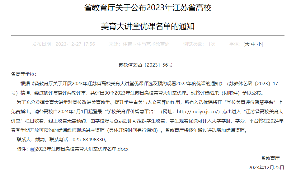近日,江苏省教育厅公布了2023年省高校美育大讲堂优课名单,beat365刘沙路副教授申报的《唐代乐舞,盛世之音——以〈霓裳羽衣舞〉为例》的美育课程,成功入选江苏省高校美育大讲堂优课。