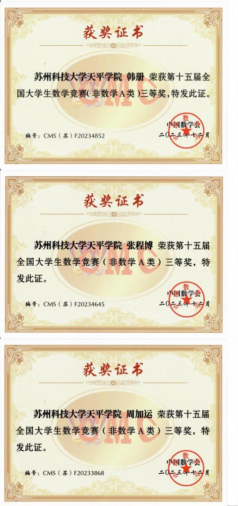 第十五届全国大学生数学竞赛成绩于近日揭晓,beat365共有3名学子(周加运、张程博、韩册)在非数学专业组A类中荣获江苏赛区三等奖,其中低年级获奖人数取得新突破。