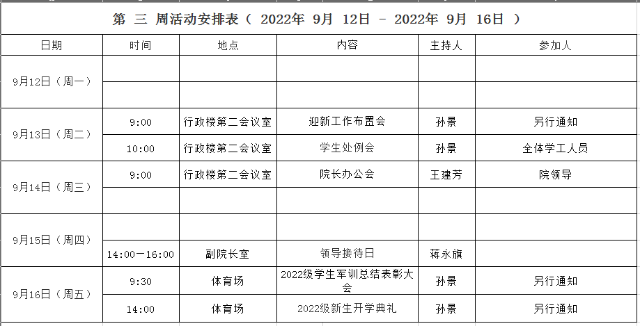 第 三 周活动安排表( 2022年 9月 12日 - 2022年 9月 16日 )