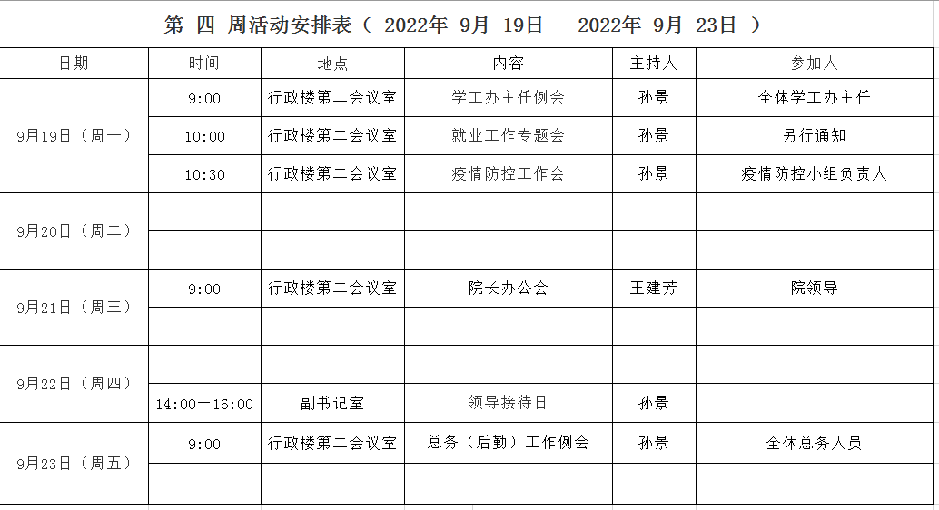 第 四 周活动安排表( 2022年 9月 19日 - 2022年 9月 23日 )