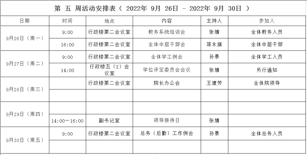 第 五 周活动安排表( 2022年 9月 26日 - 2022年 9月 30日 )
