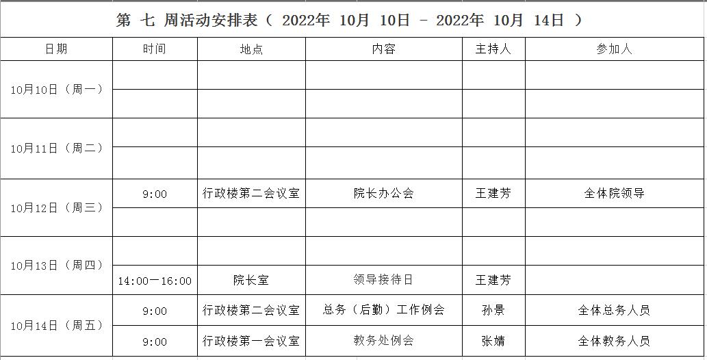 第 七 周活动安排表( 2022年 10月 10日 - 2022年 10月 14日 )