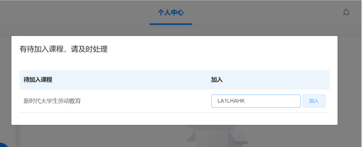 步骤二:完善账号信息后重新登录,页面跳出“有待加入课程”弹窗。学生将配套教材封底的“刮刮卡”刮开后,输入8位数激活码,即可加入劳动教育课程。重修学生激活码可继续使用。