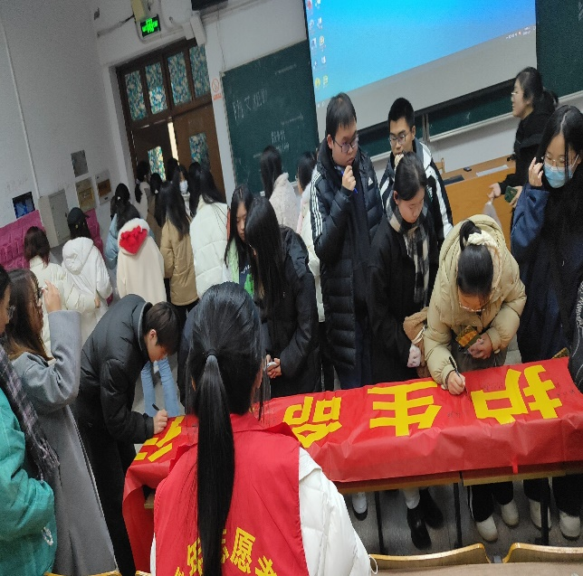 为了让更多的人了解艾滋病,大学生青年志愿者协会还组织了一次防艾观影活动。在活动开始前,志愿者们给观众们发放了防艾宣传手册,方便观众们在看电影时也能了解艾滋病。在电影中,男主人公身患艾滋病却意志坚定,积极向上的人生态度引得在场观众潸然泪下。观影活动结束后,志愿者们组织观众有秩序的在“用心呵护生命,行动抵御艾滋“的横幅上签名以表对防艾行动的支持。