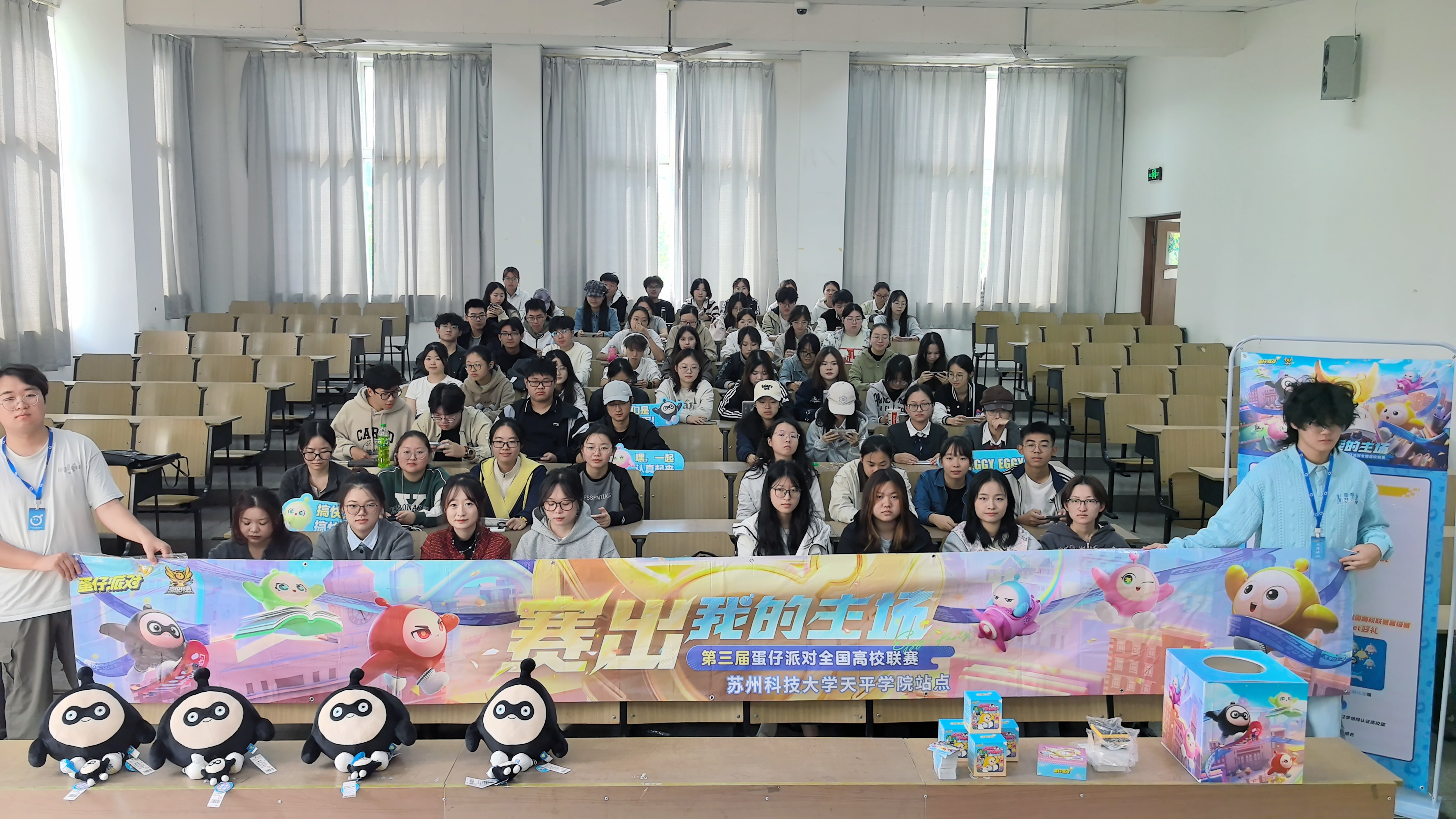 赛前筹备:细节拉满的主题赛场。从赛前空场布置可见社团的筹备巧思:赛场前端摆放着印有“赛出我的主场”的赛事主题横幅,搭配多只蛋仔形象毛绒玩偶;桌台处设置了赛事专属抽奖箱、蛋仔主题周边礼品,旁侧宣传展架清晰标注了参赛指引与互动规则——从网络调试到物料陈设,每一处都贴合“蛋仔派对”的萌趣调性,为赛事铺垫了沉浸式氛围。