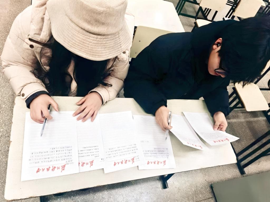 比赛期间,同学们全神贯注,从 10 段富含人生哲理的语句中精心挑选,书写的内容涵盖勤奋、坚持、友谊等诸多主题,随后手持黑色中性笔,落纸如云烟,笔锋游走如龙蛇。字体或苍劲雄浑、力透纸背,或灵动飘逸、婉转流畅,横竖撇捺间,尽显对书法艺术的诚挚热爱以及对文字精髓的深刻领悟。