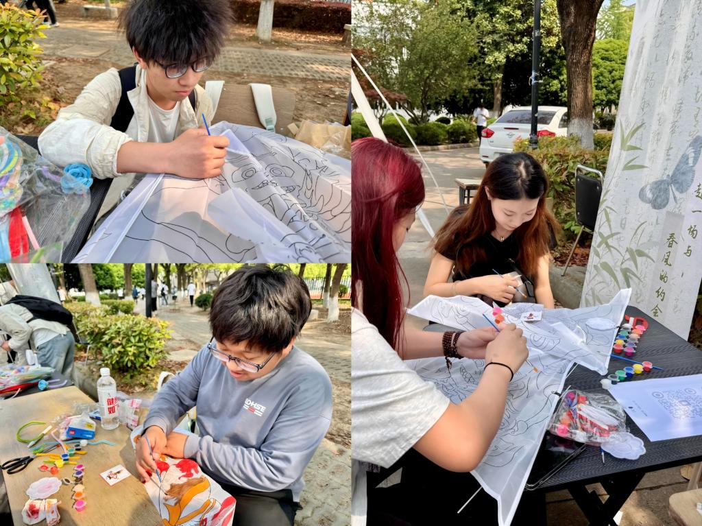 活动现场,春意盎然的布置与同学们洋溢的热情相互映衬,热闹非凡。纸风筝DIY摊位成为了整个活动的焦点。学院贴心地为同学们准备了空白风筝、颜料、画笔等丰富工具。同学们围聚在摊位前,眼神中闪烁着兴奋与期待。大家或独自沉思构思,或三两成群热烈讨论,随后纷纷拿起画笔,在风筝上尽情挥洒创意。