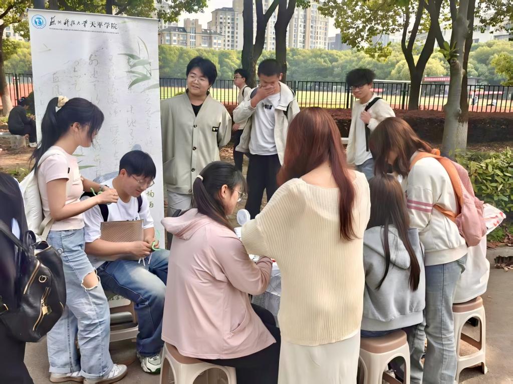 与此同时,扭扭棒手作区域同样人气高涨。学院准备了色彩丰富的扭扭棒材料,同学们专注投入,手指灵活翻转:有的精心将扭扭棒弯折、缠绕,做成了灿烂的向日葵发箍;有的则巧妙构思,制作出可爱的兔耳朵。在扭扭棒手作过程中,同学们锻炼了动手能力,深刻感受到创意带来的独特魅力,在挑选颜色、思考造型搭配时,不断培养和提升着自己的审美眼光。
