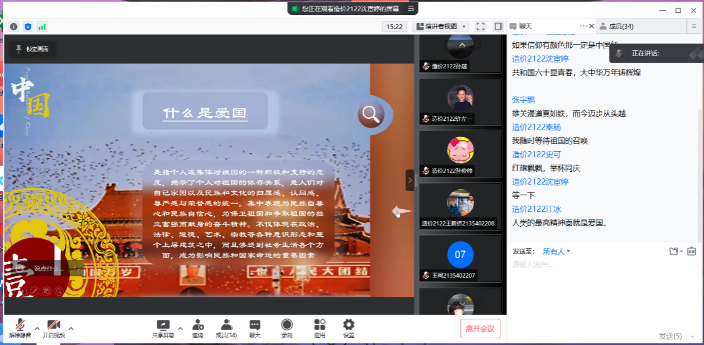 从古到今,爱国主义始终贯穿中华民族历史进程,它穿越古今,愈加焕发新的活力。本次班会活动由各班班长担任主讲人,紧密结合主题,从爱国主义本质出发,讲述国家和民族历史、民族优秀传统文化、国情现状、国际形势等,让同学们从知国、爱国、报国三个方面深入学习爱国主义。通过PPT的讲解,同学们回眸过去,重温百年光辉历程,边关战士将矢志不渝的爱国主义作为一种信念、一种信仰;攻坚克难的科研人员,数十年如一日默默为国付出;面对洪涝灾害,无数军人驰援抗洪一线,用身体构筑成守护生命的铜墙铁壁;疫情当下,无数白衣天使日夜坚守岗位,舍小家为大家,以生命赴使命、用挚爱护苍生...... 仰望历史的天空,爱国情怀熠熠生辉,跨越时间的长河,爱国情怀绵绵不断,广袤的神州大地上,暖流从未断流,热情从未熄灭,爱国主义精神亦从未消退。世界上没有一蹴而就的成功,更没有从天而降的“伟力”,那些不急不躁、怀着爱国心砥砺奋进的人,才是平凡岁月中最靓的“仔”。活动结束后,经学院老师评选,建工1921班、造价1922班、土木2025班、造价2121班、造价2122班五个班级荣获“优秀班会奖”。