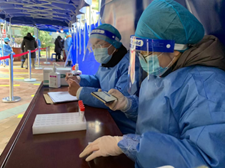 营销19级(专转本)的王怡安同学主要负责居民信息录入、核酸试管的密封装袋以及外场秩序维持。为避免交叉感染,每为一名居民录入信息和装袋之后,她都要用冰冷的消毒液反复为自己的双手消毒,为此她只能在采样间隙,反复搓擦自己的双手产生一点点热量让自己双手还有知觉。居民们送来了暖宝宝、暖水瓶、小暖炉,她的身上冷了,心里却热了。