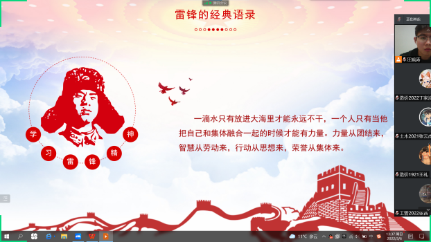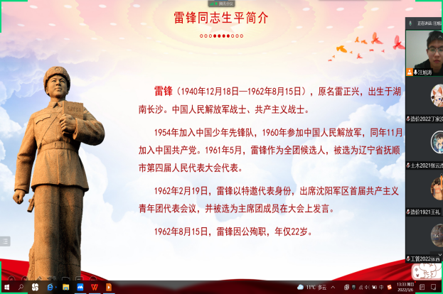 今年3月5日是第60个“学雷锋”日,也是我国第23个“青年志愿者服务日”。为弘扬“奉献、友爱、互助、进步”的志愿精神,勉励广大青年学子要学习雷锋“毫不利己、专门利人”的为民情怀和“吃苦在前、享受在后”的奉献精神,进一步引导全院团员青年培育和践行社会主义核心价值观,推动雷锋精神薪火相传,苏科大天平土木学院团总支特别开展学习雷锋精神微团课,围绕雷锋的生平介绍、雷锋精神的具体表现、雷锋经典语录和弘扬雷锋精神的重要性等方面展开学习了雷锋精神的具体内容。