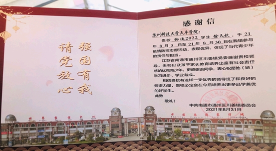 近日,我校收到来自中共南通市通州区姜镇委员会的感谢信,信中指出我校管理学院20级物流管理专业的徐天杭同学在疫情防疫的紧要关头,主动请缨加入“逆行者”的队伍中,协助镇疫情防控指挥部开展宣传引导、信息排查、卡口值守、核酸采样等工作,认真负责表现优异,在这期间徐天杭同学充分体现了当代大学生家国情怀与爱国担当。
