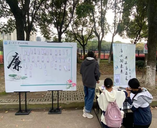 工作人员线下进行摆摊,同学们在相应时间内到达指定地点领取书签并书写有关廉洁主题内容,书写完将书签粘贴在活动立板上。在活动现场,同学们都积极参加,挑选自己喜欢的书签并写上与廉洁有关的宣传语,写完后,同学们将自己写的书签粘在活动立板上。在现场,同学们写的书签展示吸引了更多的同学观赏,进一步宣传了廉洁文化,吸引了更多的同学参与此次活动,活动现场十分热闹。同学们还可以领取到信纸,参与廉洁主题征文活动,展现自己的文采,宣扬廉洁主题文化。