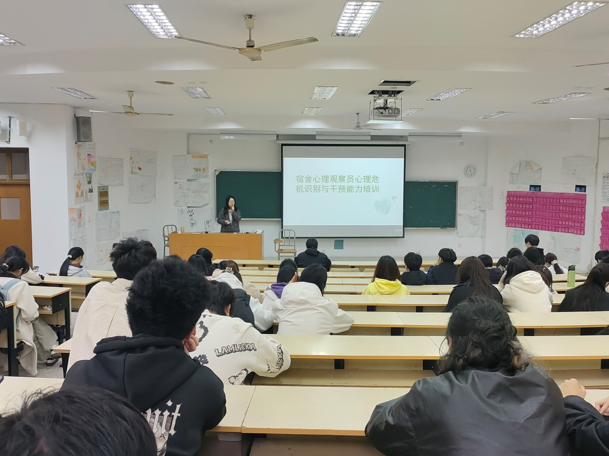本次培训会整体围绕宿舍心理观察员的角色与职责、大学生心理健康、心理危机识别与干预三个方面展开。
