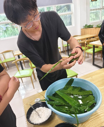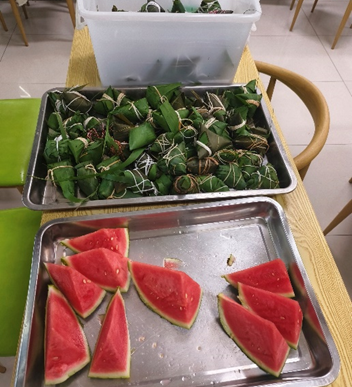 首先,土木2321班委从视频中学习包粽子需要的材料,如:粽叶、糯米、蜜枣、咸蛋黄等,提前去超市进行采购;其次,班长给同学们示范包粽子的姿势和手法,然后,请来食堂阿姨指导包粽子的技巧,同学们越发熟练。最后,团支书将提前购置好的西瓜切开分给同学们,让同学们在活动过程中得到休息,并且提高了大家的积极性。