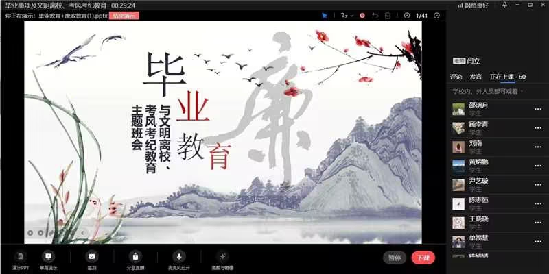 本次毕业教育通过线上线下多种形式同步开展,包括主题班会、网上课堂等多种形式,使每一个毕业生都可以感受到母校的温暖和关怀,让他们有更加坚定的信念和更加饱满的热情迎接未来人上路上的机遇与挑战。