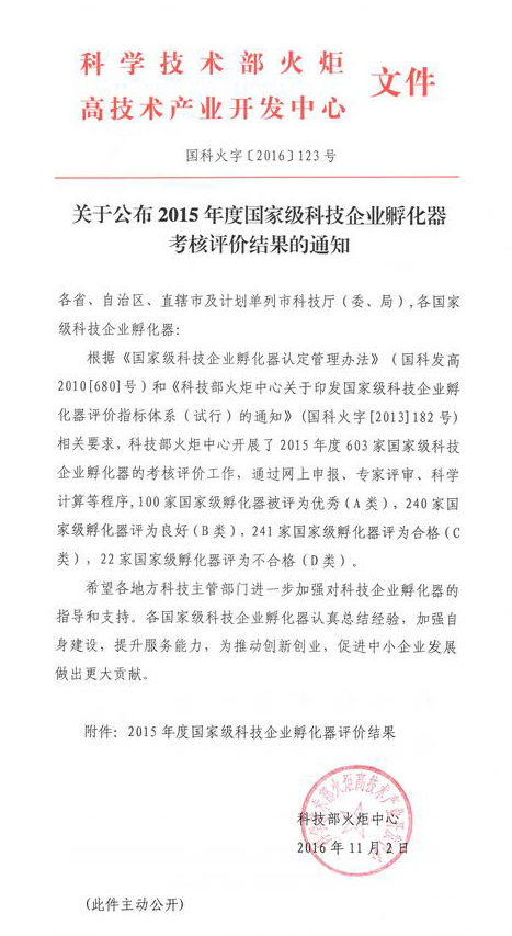 近日,科技部火炬中心公布了2015年度国家级科技企业孵化器考核评价结果,3499cc拉斯维加斯国家大学科技园孵化器被评为“A类国家级科技企业孵化器”称号。